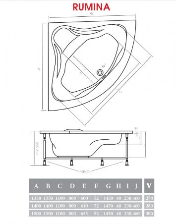 Угловая акриловая ванна RUMINA создана ведущими европейскими дизайнерами. Данная модель имеет удобное сиденье, что особенно актуально, если предполагается использование ванны ребенком. К тому же слив-перелив, расположенный посередине и «солидные» габариты, позволяют удобно разместиться в любом краю ванной, а также вдвоем. Ванна произведена из 100% акрилового листа.