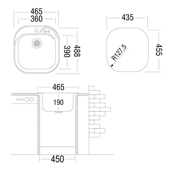 Модель кухонной мойки без крыла с закругленными углами. Особенность – перелив справа от площадки под смеситель.