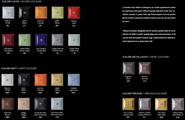 Возможные цвета: белый, чёрный, оранжевый, жёлтый, красный, бордо, зелёный, голубой, коричневый, беж, а также возможно декорирование раковины золотом или серебром.