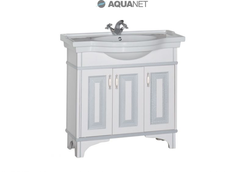 Напольная тумба комплекта Валенса в стиле «неоклассика», для которого характерны прямые линии, лёгкость и изящность, стремление к уюту, гармонии. Отделка фасада тумбы создана вручную с помощью специальной техники покраски краколет, создающей изящный эффект состаривания. Растрескивание красочного слоя наделяет мебель духом благородного шарма, которая придает интерьеру помещения богемный, а вместе с тем и домашний, уютный вид. Сочетание черного матового покрытия с глянцевой белизной раковины из качественного фаянса придает комплекту мебели основательность и завершенность. Функциональная часть тумбы представлена несколькими вместительными полками на распашных дверцах. Сочетание белого матового покрытия с глянцевой белизной раковины из качественного фаянса придает мебели основательность и завершенность. Среди достоинств также декоративные винтажные ручки дверок, которые снабжены доводчиками для плавного закрывания.